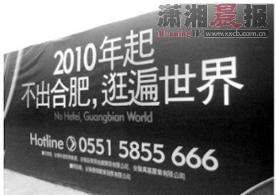 據《現代快報》報道日前,某新浪微博網友發布了一張照片,稱:"合肥史上最牛翻譯,頂級翻譯看了都落淚"。圖片顯示的是一則樓盤廣告"不出合肥,逛遍世界",下面赫然顯示著英文翻譯為"NoHeFei,GuangbianWorld"。這條樓盤廣告不但有圖有真相,而且照片上還有樓盤的電話。
