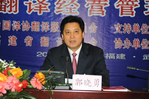 中國外文局常務副局長、中國翻譯協會第一常務副會長郭曉勇在開幕致辭中指出,黨的十七屆六中全會通過的《中共中央關于深化文化體制改革 推動社會主義文化大發展大繁榮若干重大問題的決定》對翻譯行業而言是一個難得的機遇。作為文化產業的一個重要組成部分和中華文化走向世界必不可少的橋梁,翻譯行業在推動社會主義文化大發展大繁榮中的作用更加凸顯。他號召翻譯行業認真學習、領會和貫徹十七屆六中全會精神,統一認識,明確方向,充分認識肩負的使命和責任,采取切實的措施使翻譯服務產業更好更快地發展,從而更好地為國家的文化發展戰略服務。