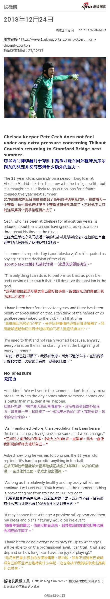 切爾西中文網翻譯團:切赫淡定應對庫爾圖瓦回歸切爾西